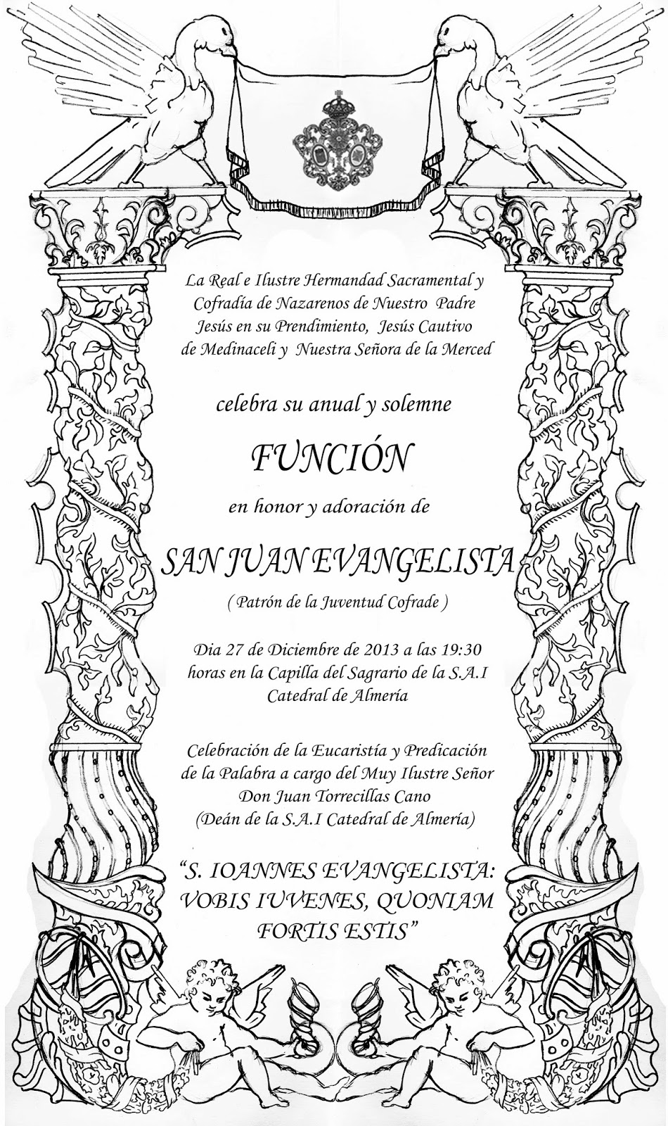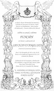 El próximo viernes Función en honor a San Juan Evangelista, 19:30 horas, Capilla del Sagrario Catedral, se bendecirá el nuevo mantolín bordado para la imagen del patrón del grupo joven, bordado y donado por el vocal de juventud Rafael Soriano Rodríguez.